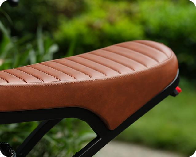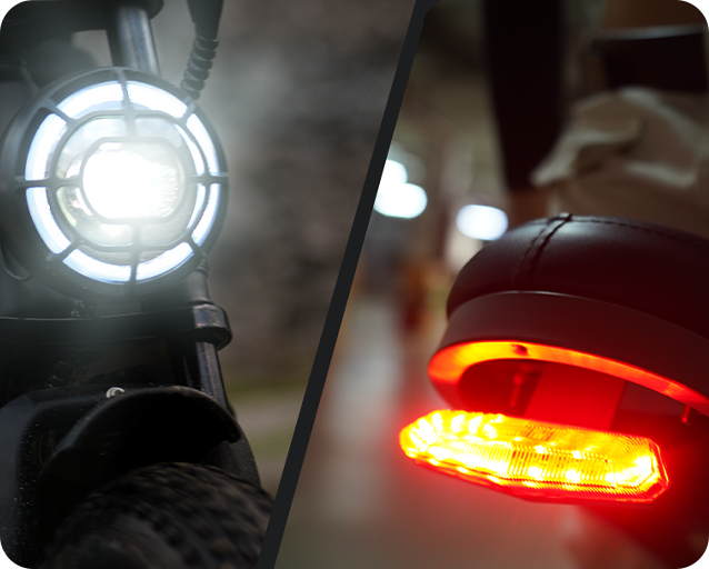 Rear disc brakes, tires, integrated lights, and suspension ensure safe riding.